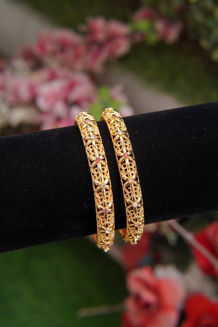 Expertly crafted with fine copper and luxurious gold plating, these 2 Pcs Gold Plated Kangans are a stunning addition to any jewelry collection. The vibrant ruby color adds a touch of elegance, and they come as two pieces for versatile styling options. Elevate any outfit with these timeless pieces.