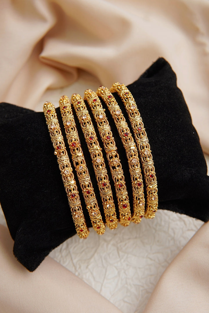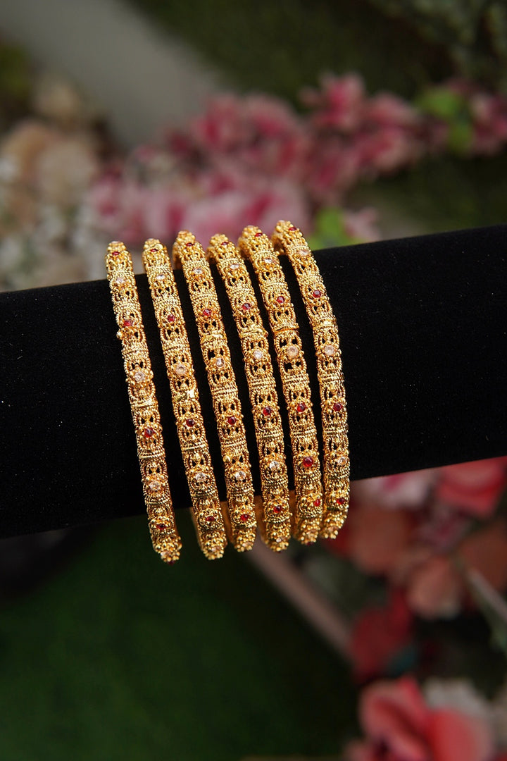 Introducing our 6-piece Golden Maroon Champagne Churi Set, expertly crafted with gold plating and fine polish for a luxurious look. Adorned with sparkling zircons and made with high-quality materials, these bangles are perfect for any occasion. Elevate your style and embrace quality with this premium churi set.