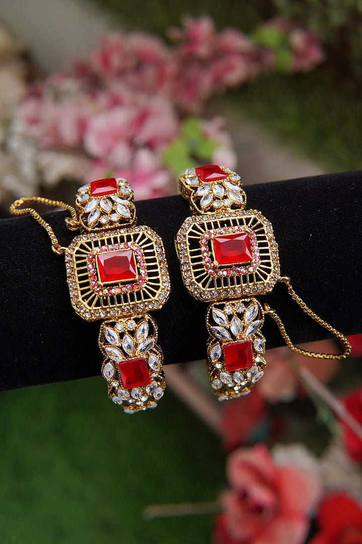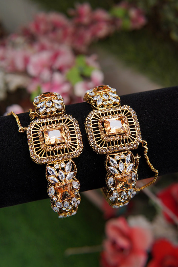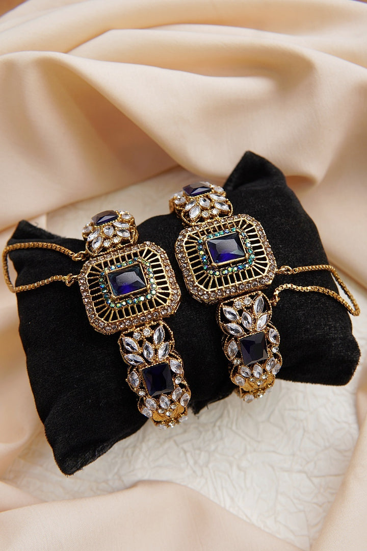Expertly crafted with antique gold plating and semi-precious gemstones, these openable kangan bangles add a touch of elegance to any outfit. Made with high quality materials, these bangles are durable and versatile, perfect for any occasion. Elevate your style with Antique Gold Gemstones Kangan.