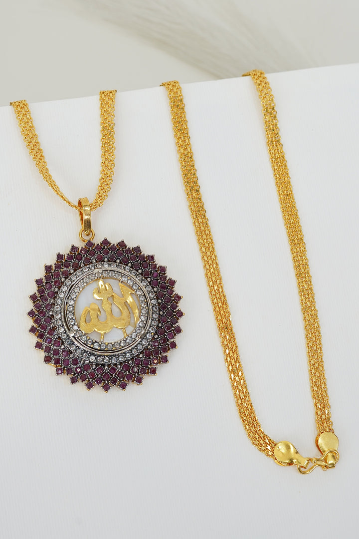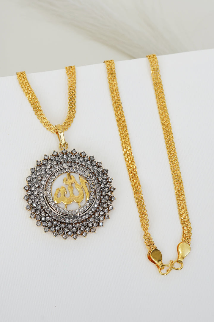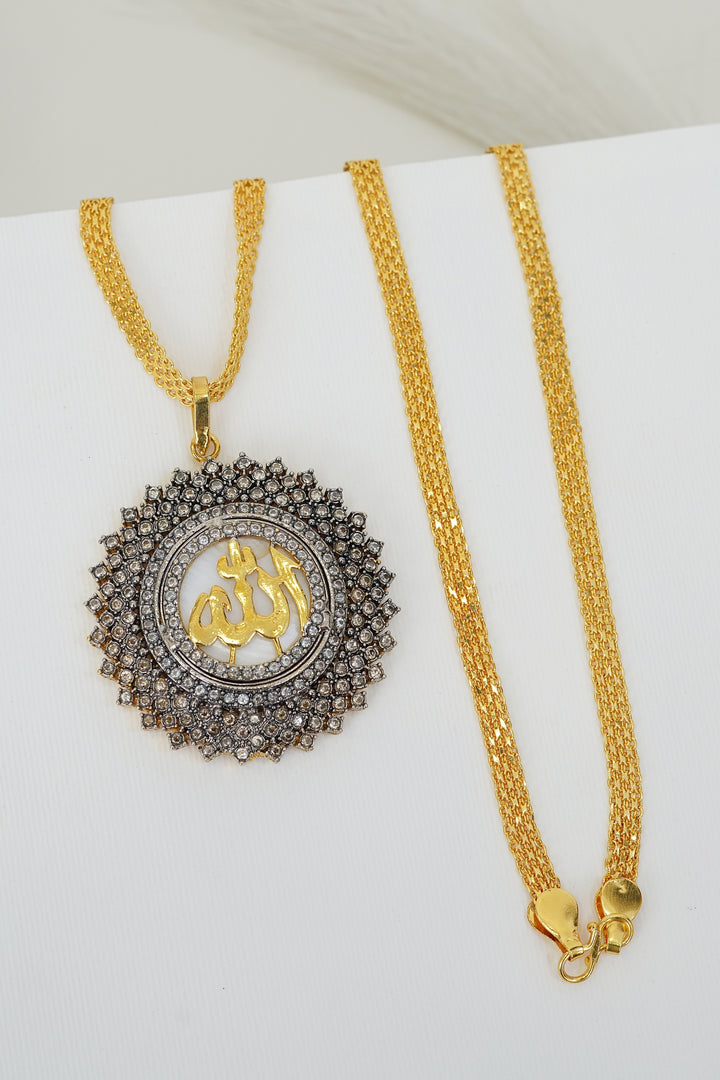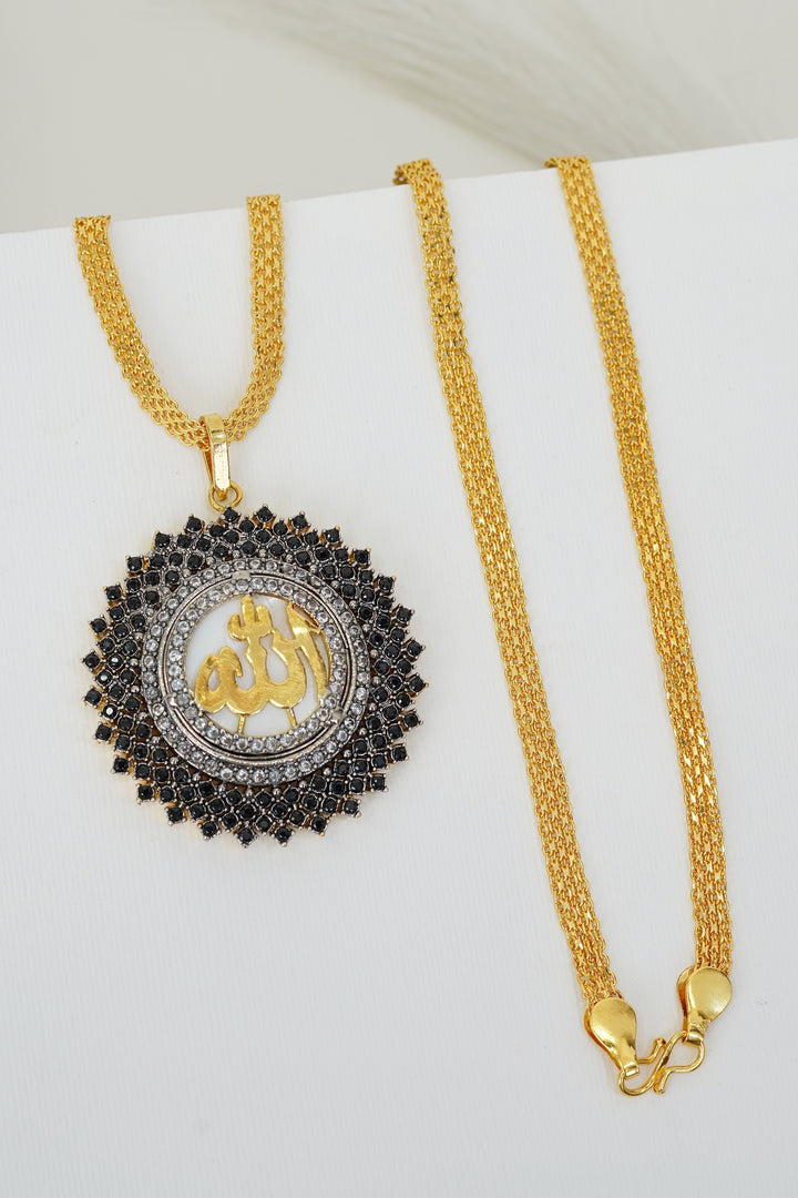 As a product expert, I inform you that the Cubic Zircon Gold Plated Calligraphy Pendant is made with pure gold plating and features high-quality cubic zirconia stones. The 28-inch long chain is copper-based, ensuring durability and long-lasting shine. Add a touch of elegance and luxury to any outfit with this stunning pendant.
