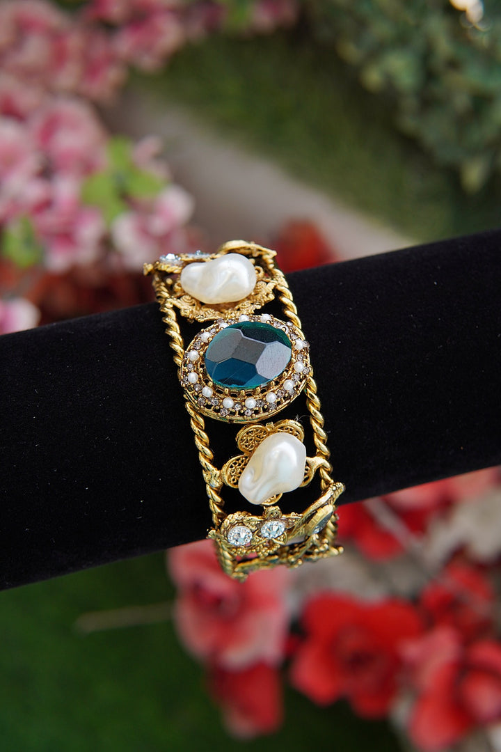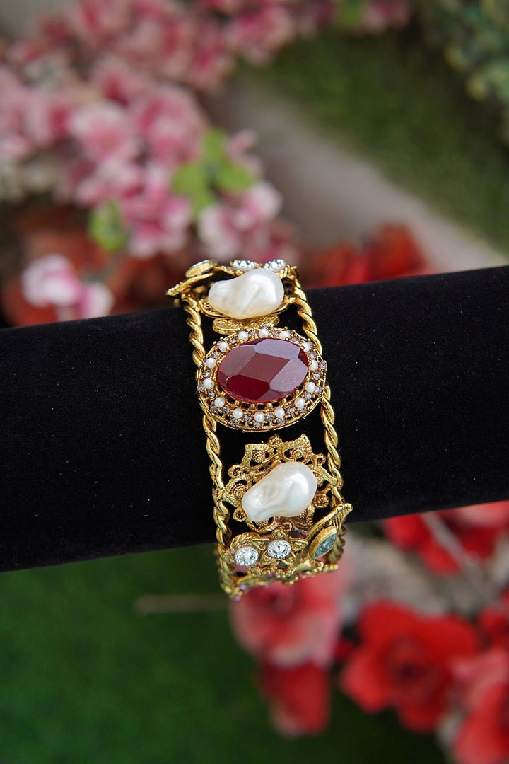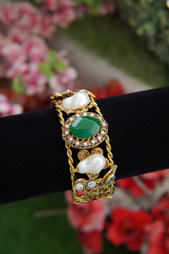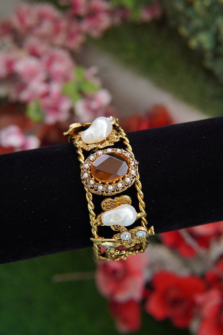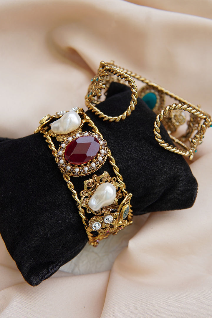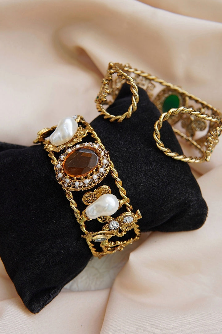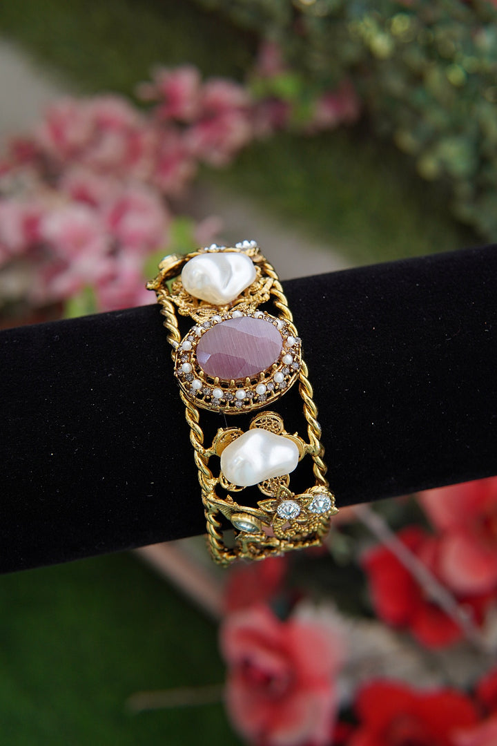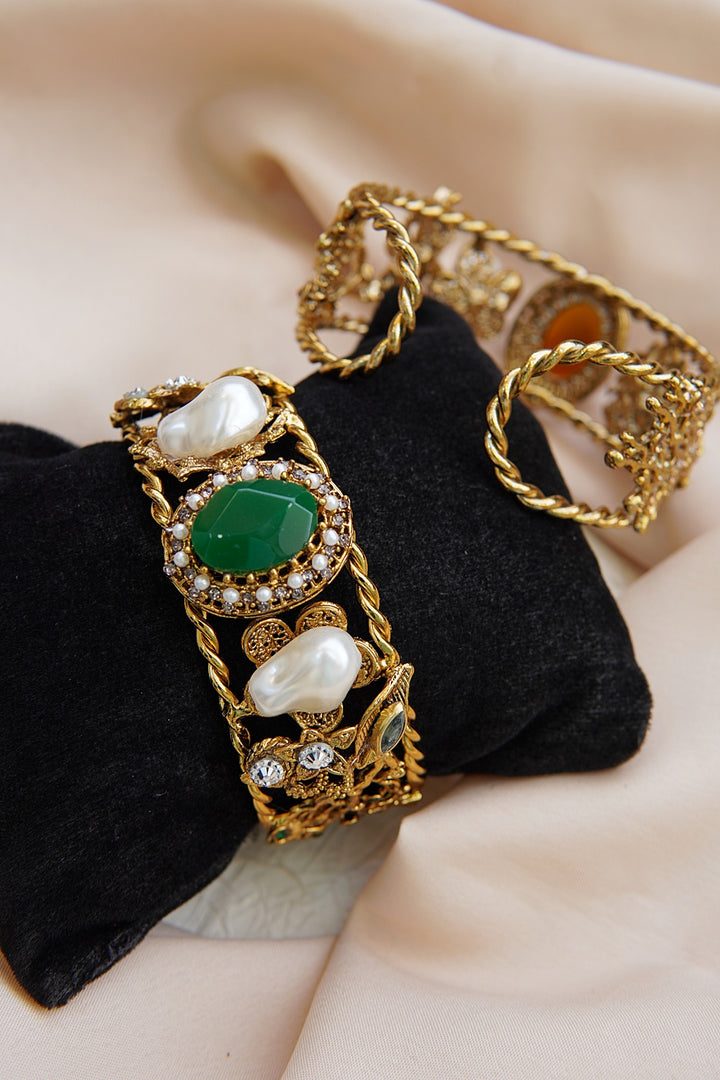 Introducing the Gems Mother Pearl Antique Bracelet Kara - a stunning accessory with an antique gold plating that exudes elegance and charm. Each bracelet features semi-precious gemstones and a beautiful mother of pearl, all attached to an adjustable copper base. Perfect for any occasion.