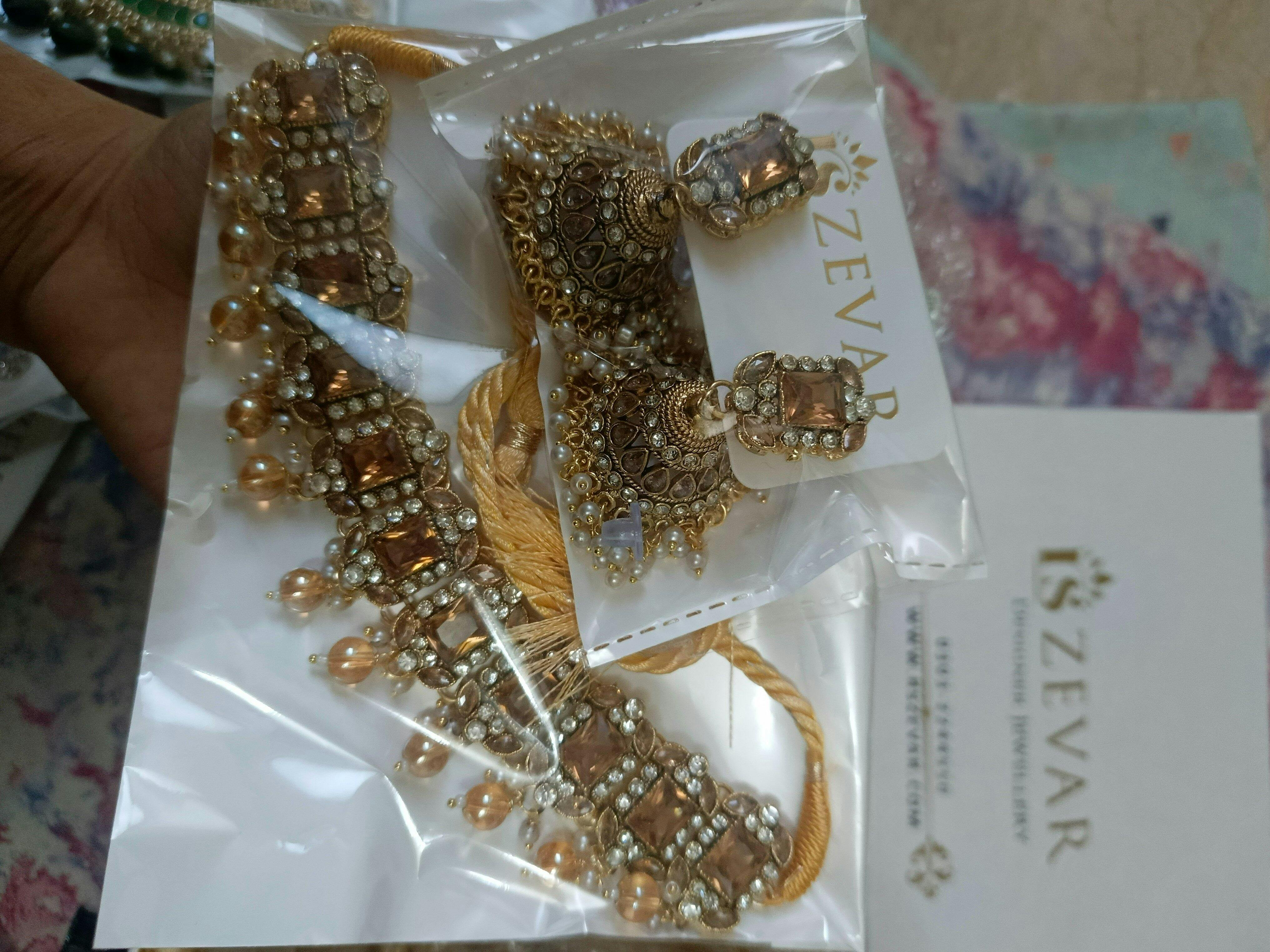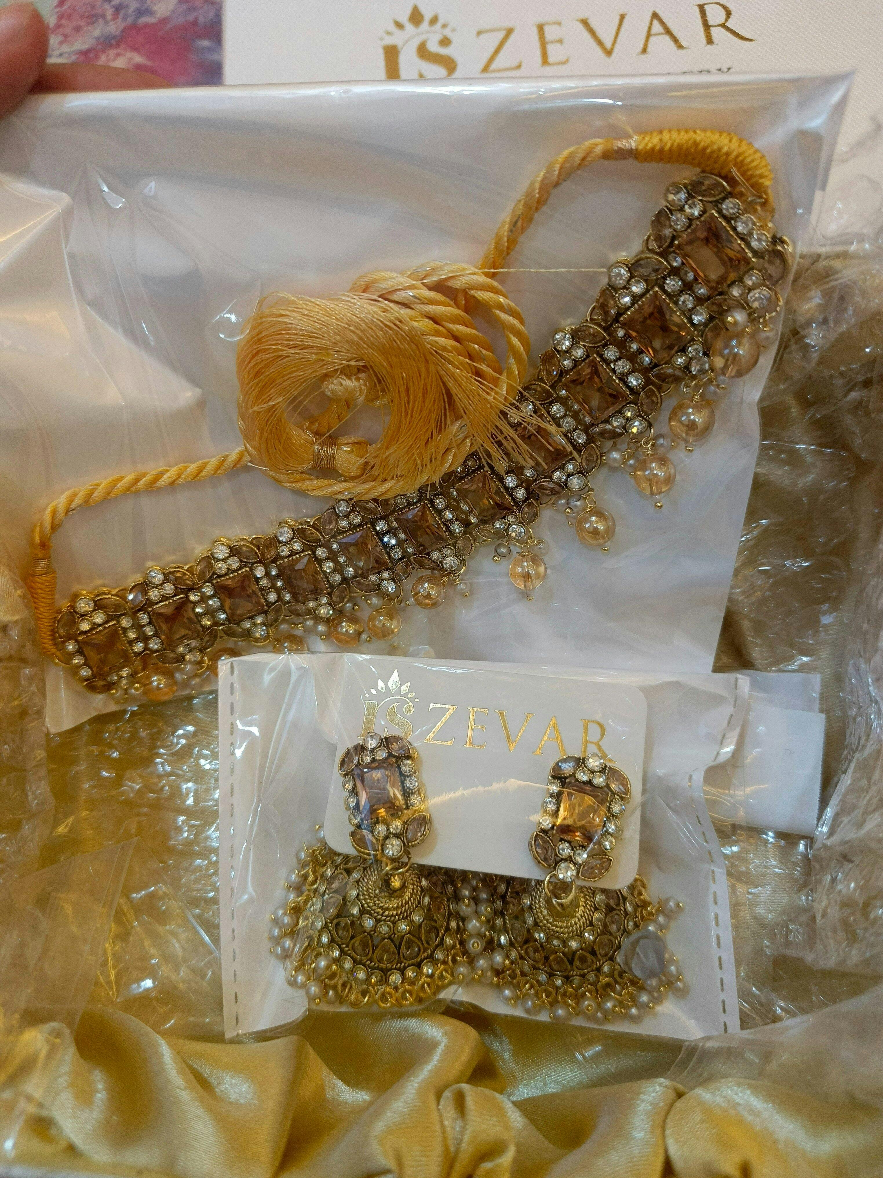 Enhance your style with our Gemstone Shimmering Necklace Set. A bold golden base and glowing gemstones create a dazzling effect for any occasion. Crafted with copper casting and handwork choker, this set is a must-have for a luxurious and eye-catching look.