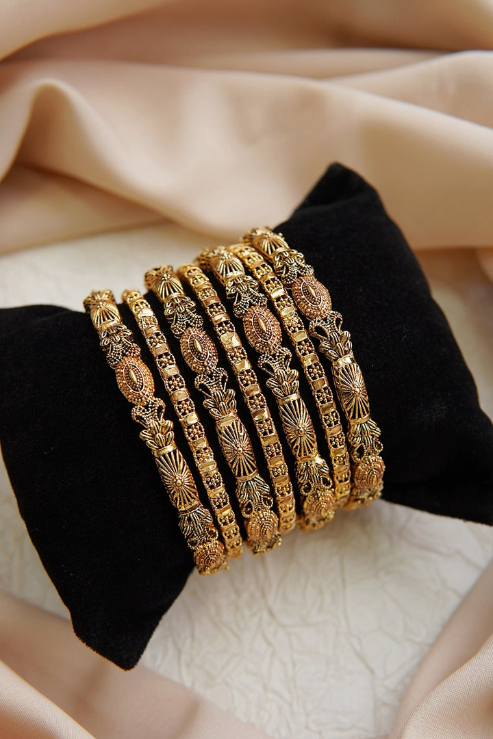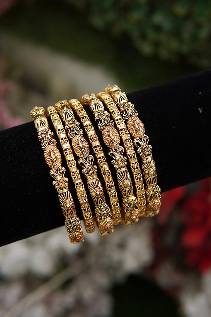 Step up your jewelry game with our Gold Look a Like 7 Pieces Churi Karay Set. Made with the highest quality copper, this set features 7 pieces of bangles that give off a pure gold look. Not only does it add a touch of elegance to any outfit, but it also radiates a beautiful vibe while wearing.