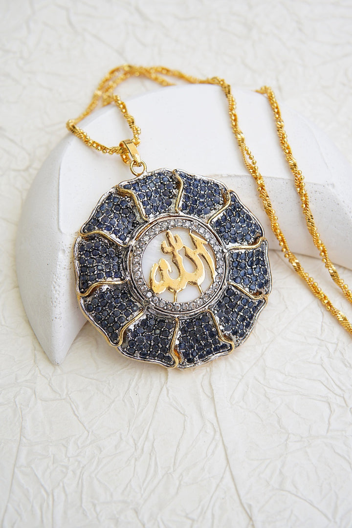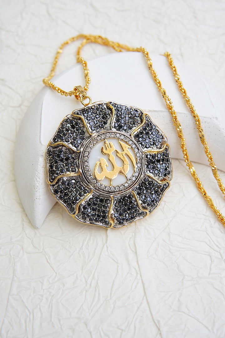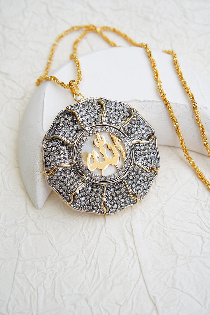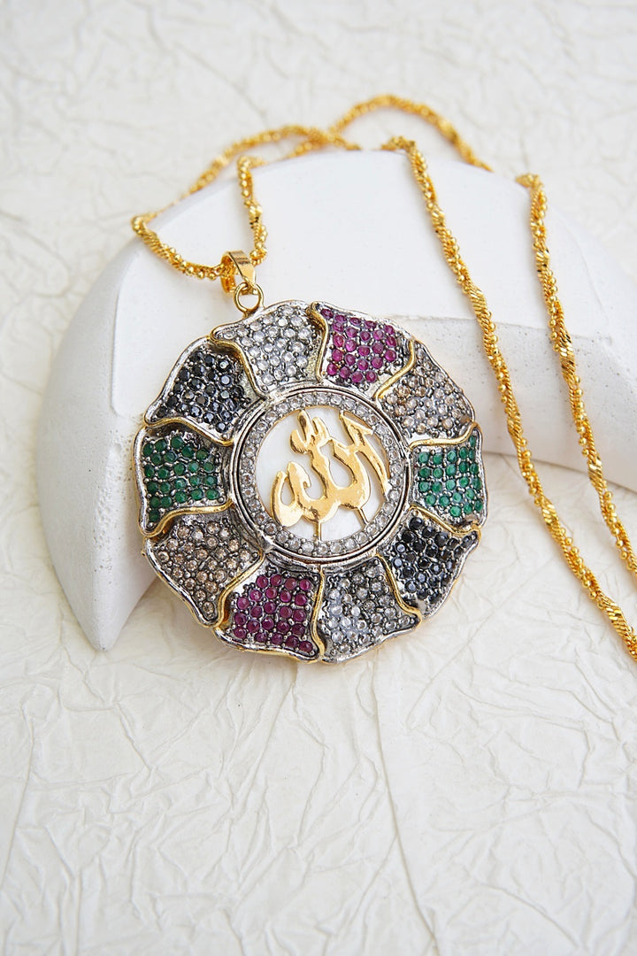 Expertly designed and crafted, this Gold Plated Calligraphy Zircons Pendant shines with its brilliant polish and rhodium and lecker plating. The pure micro zircons add an elegant touch, making it a high quality pendant. Complete with a 28 inch long gold plated chain, this piece is both sophisticated and versatile.