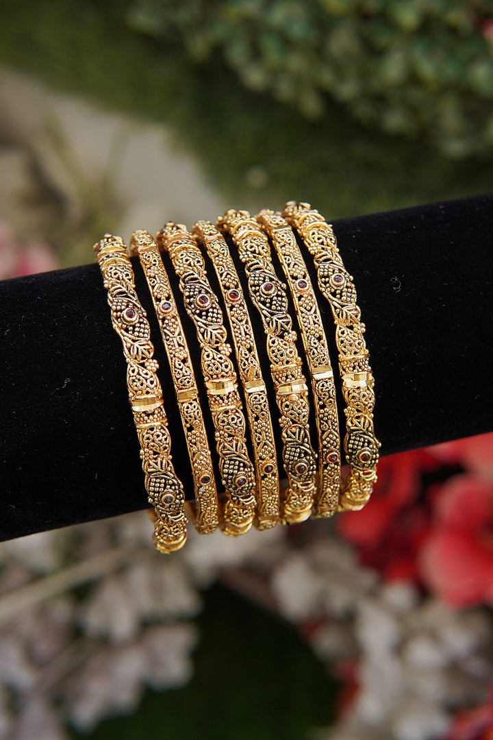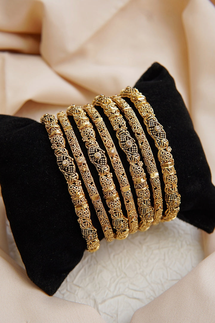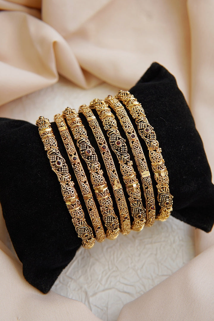 Indulge in a regal display of elegance with our Heritage Filigree Antique Bangles. Handcrafted with delicate patterns and a vintage finish, these bangles perfectly blend traditional designs with refined sophistication. Elevate your bridal attire or add a touch of heritage to any ethnic occasion with these exquisite pieces.