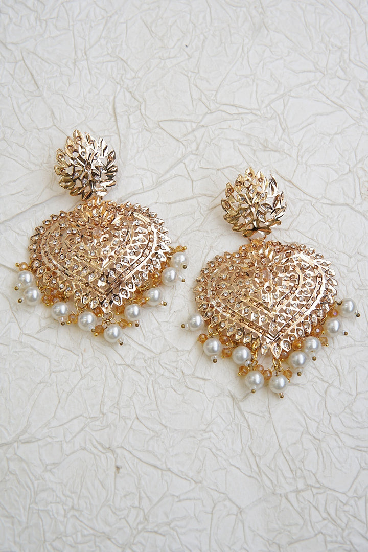 These Hyderabadi Gold Plated Latkan Earrings are crafted with gold shine plating and handcrafted to perfection. Handmade pearls latkans complete the look, which hangs at an approximate length of 3 inches. Rejoice in this beautiful, timeless piece.