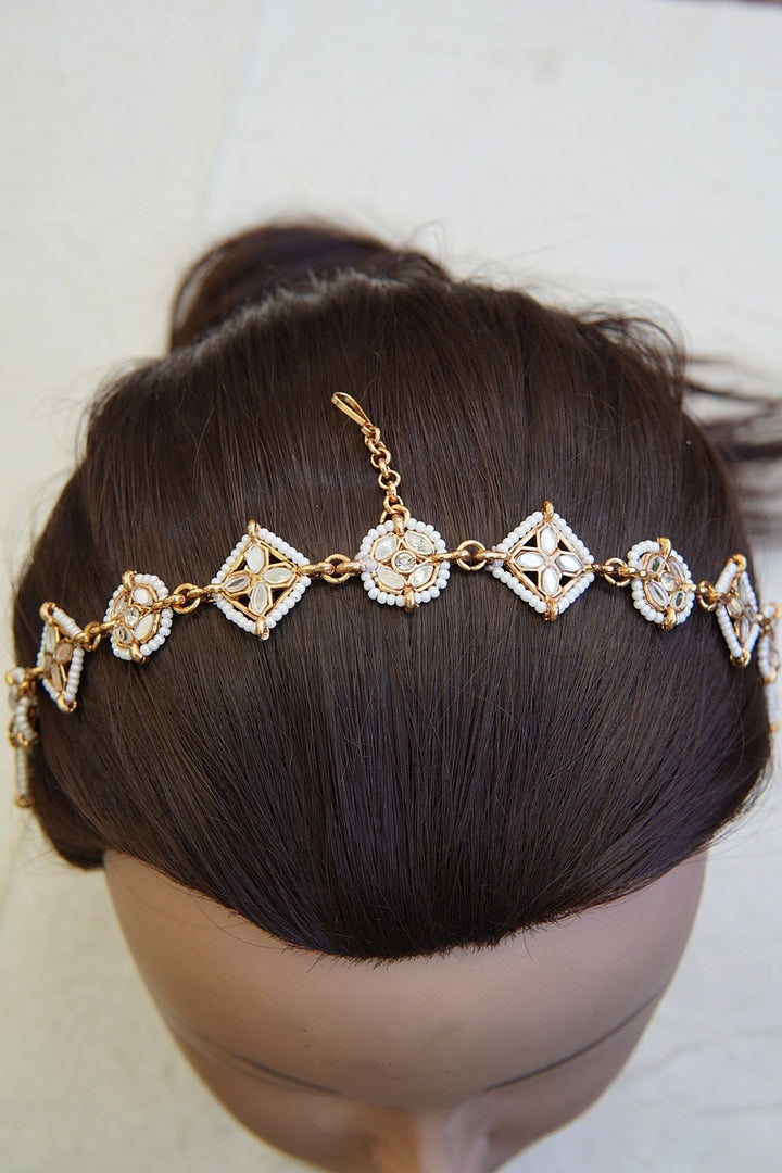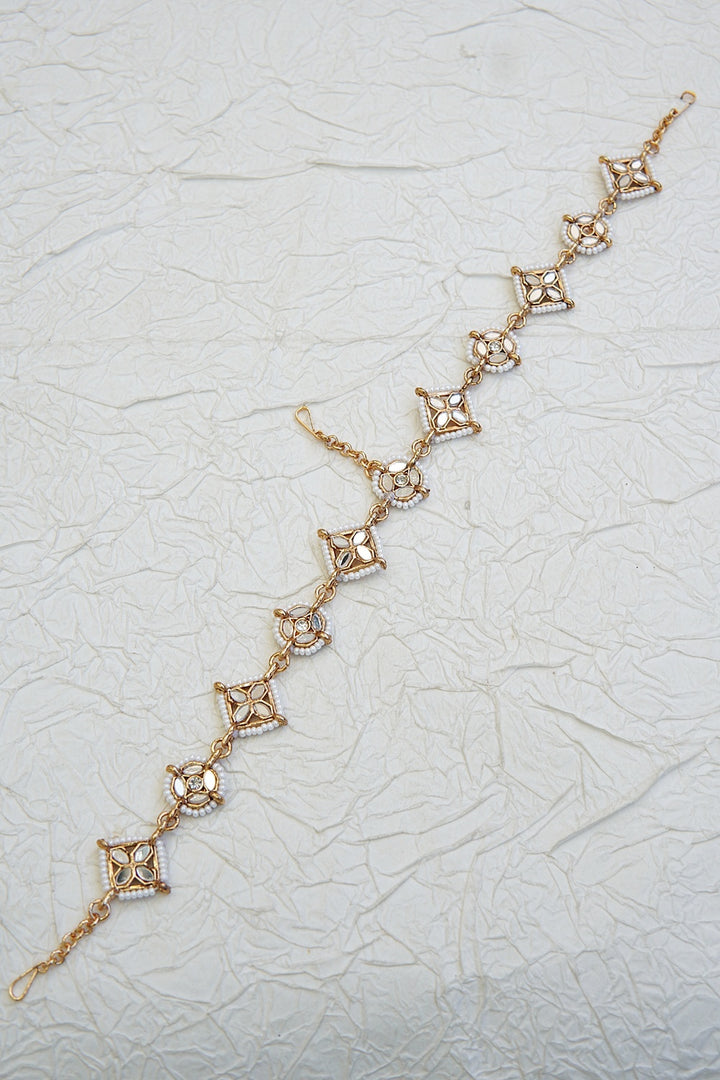 Elevate your style with our Kundan Cut Sheesh Patti! The golden based plating and bronze base material offer a luxurious touch while the cut kundan adds a chic element. This beautiful headpiece is currently trending and sure to make a statement.
