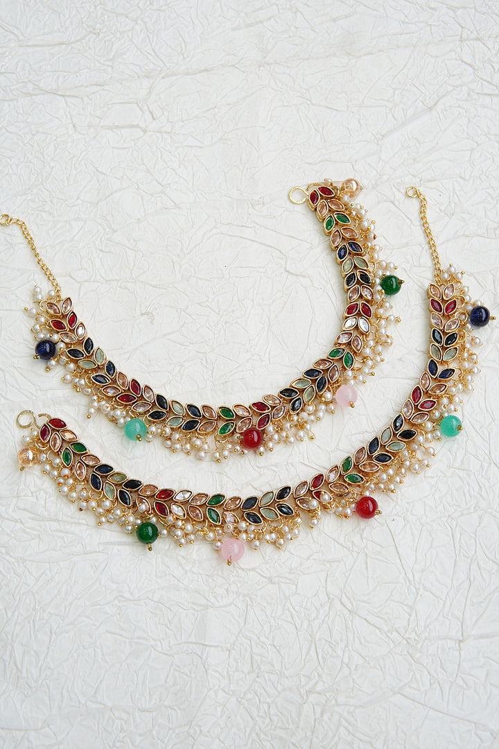 Crafted with golden plating and semi-gemstones, these Kundan & Gemstone Anklets feature high-quality work and are made from copper-based material. Elevate your style with these beautifully designed anklets.
