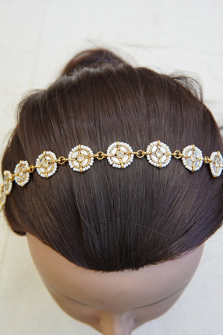 Transform your look with our Kundan Sheesh Patti, expertly handmade with high-quality bronze material and adorned with dazzling kundan stones. Make a statement with this trending headpiece.