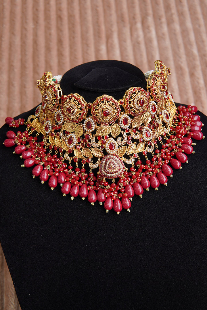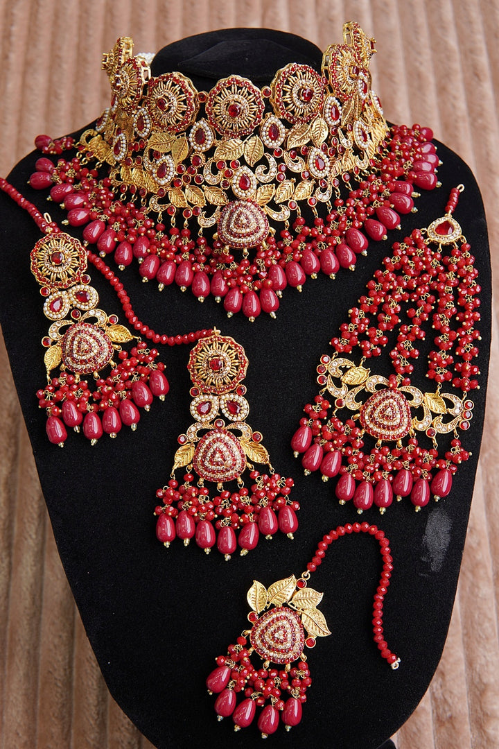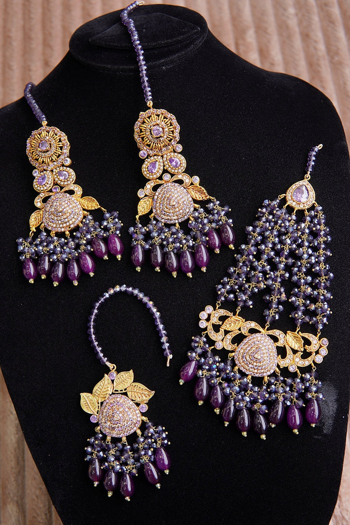 - This luxurious bridal set is crafted with the highest quality gold plating, real cubics zirconia, and handmade pearls. The intricate latkan details add an extra level of elegance, perfect for the most special of occasions.