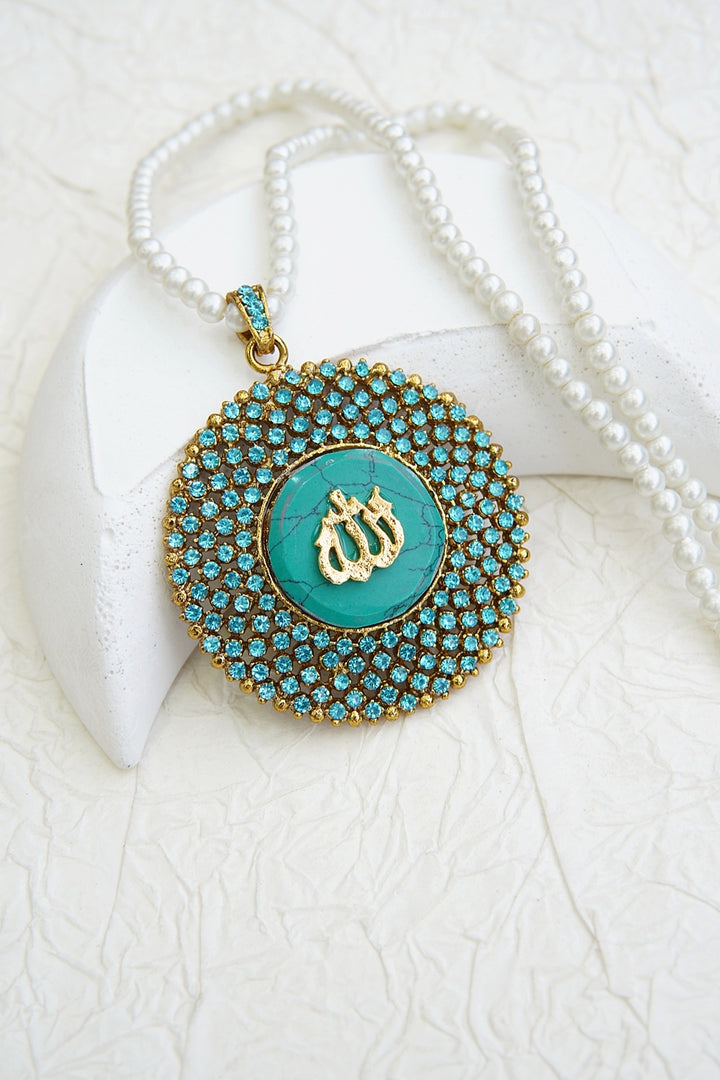 Elevate any outfit with the Majestic Allah Calligraphy Pendant. Made with pure gold plating and high-quality cubic zirconia stones, this pendant exudes elegance and luxury. The 22-inch pearl mala adds durability and long-lasting shine. Make a statement with this beautiful and timeless piece.