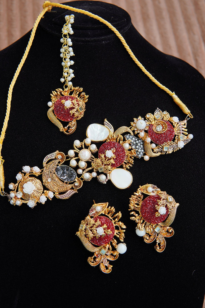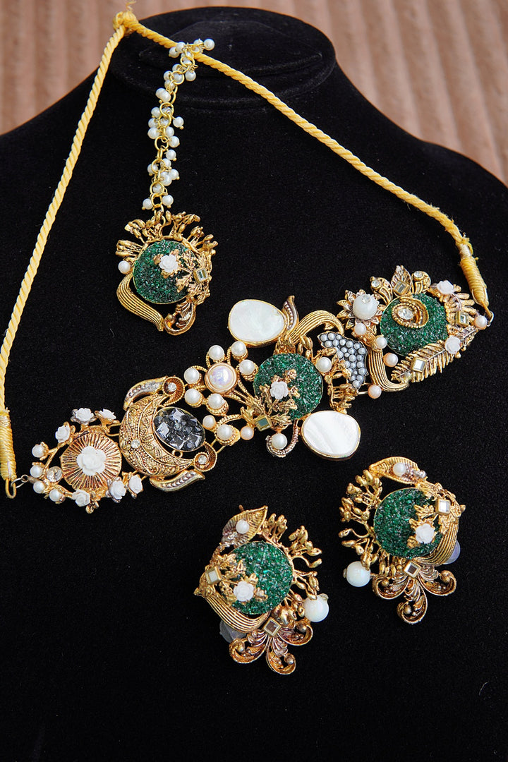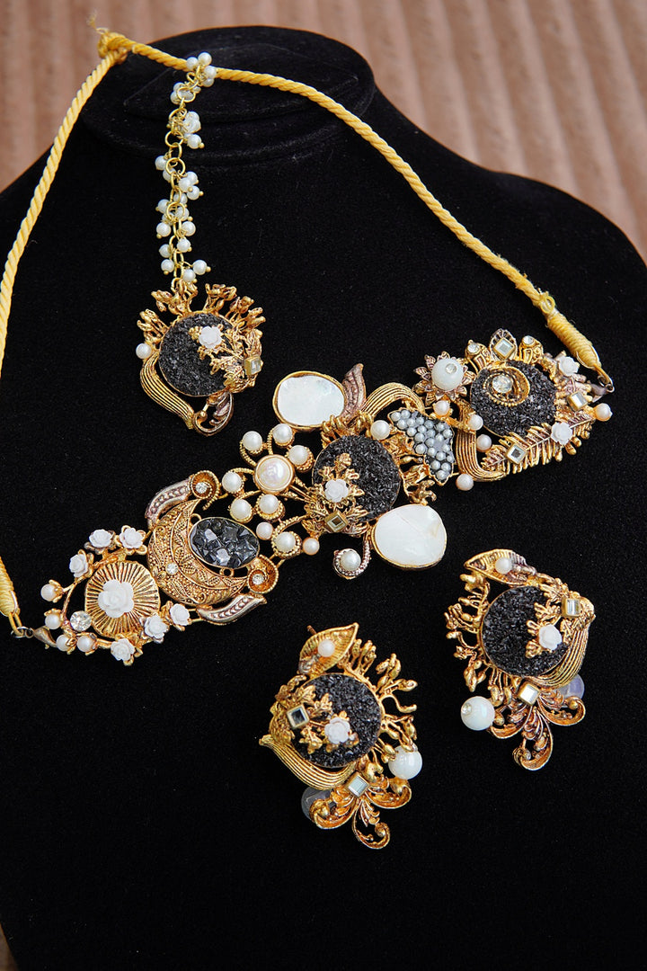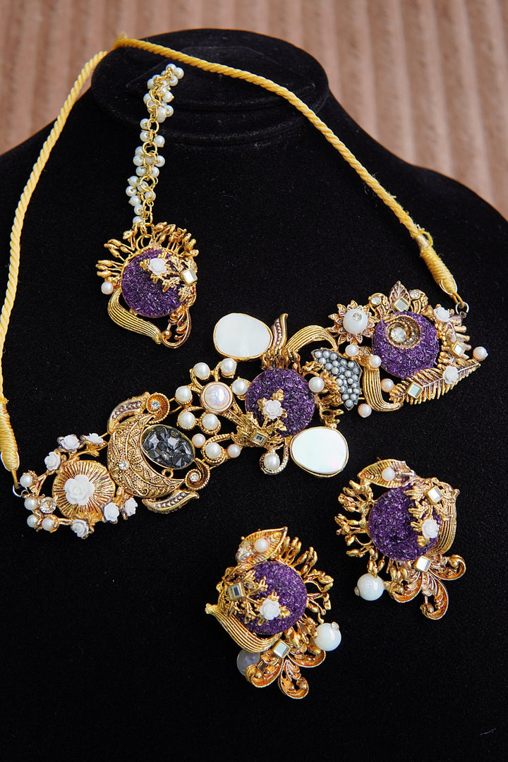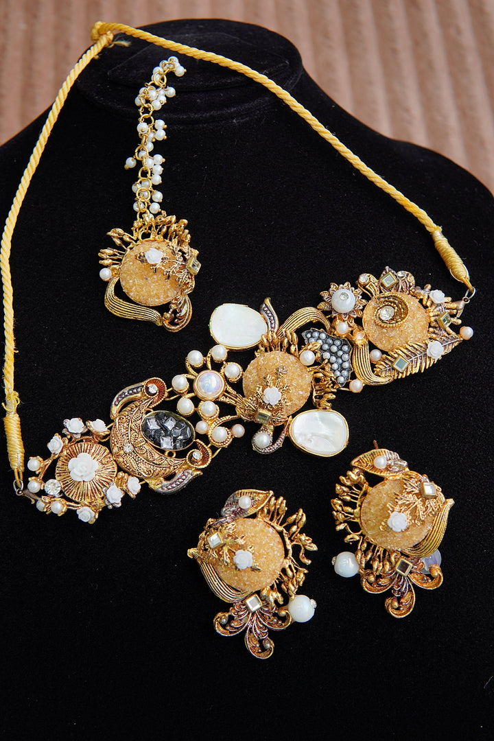 This Turkish style set features lustrous mother of pearl stones accented with semi-gems and crush stone work, all handcrafted with antique gold plating. Enhance your outfit with this exquisite, expertly crafted jewelry set.