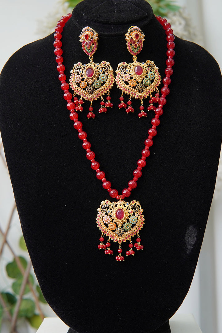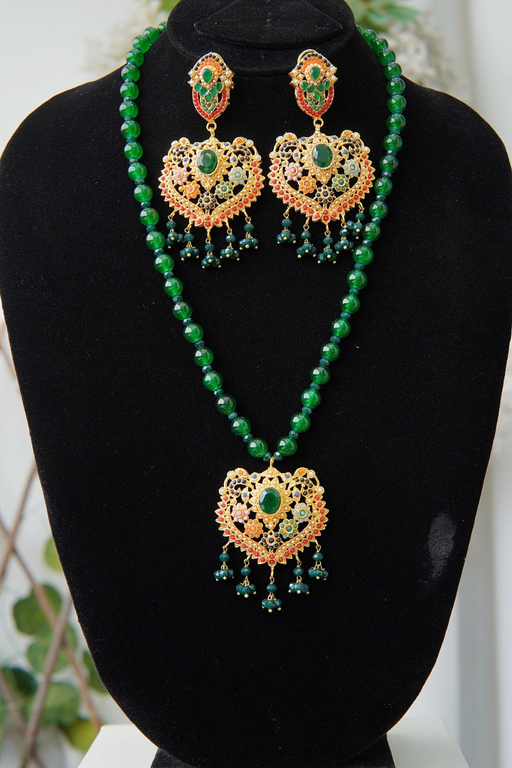 Elevate your ethnic look with the Navratan Long Haar Set, featuring a stunning golden base plating and high-quality handmade work. This beautiful set is the perfect accessory to add a touch of elegance to your attire. Exude a regal aura with its intricate design.