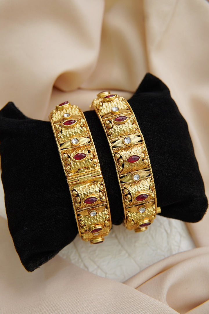Elevate your ethnic style with our Regal Rajwadi Temple Kada Bangles. Adorned with intricate temple-inspired designs, these bangles bring a touch of royal charm to any outfit. Perfect for weddings or festivals, these bangles exude a timeless elegance that will make you stand out.