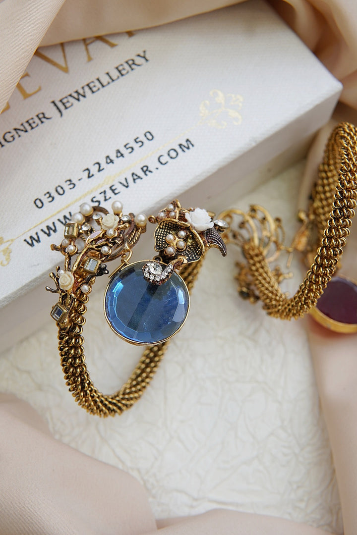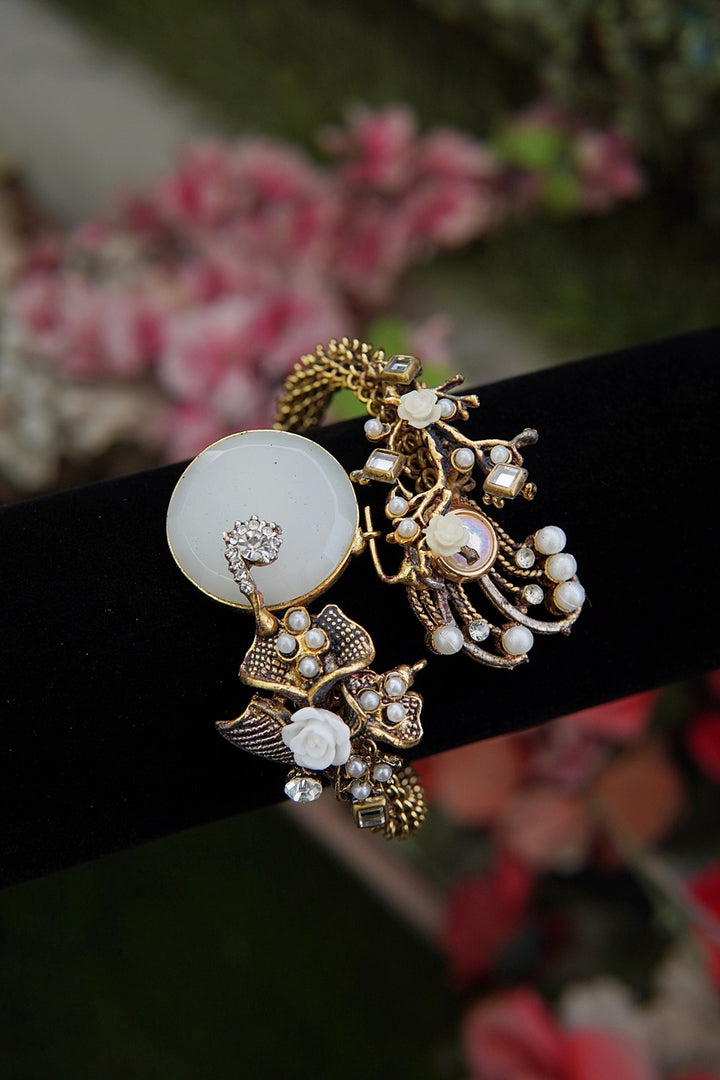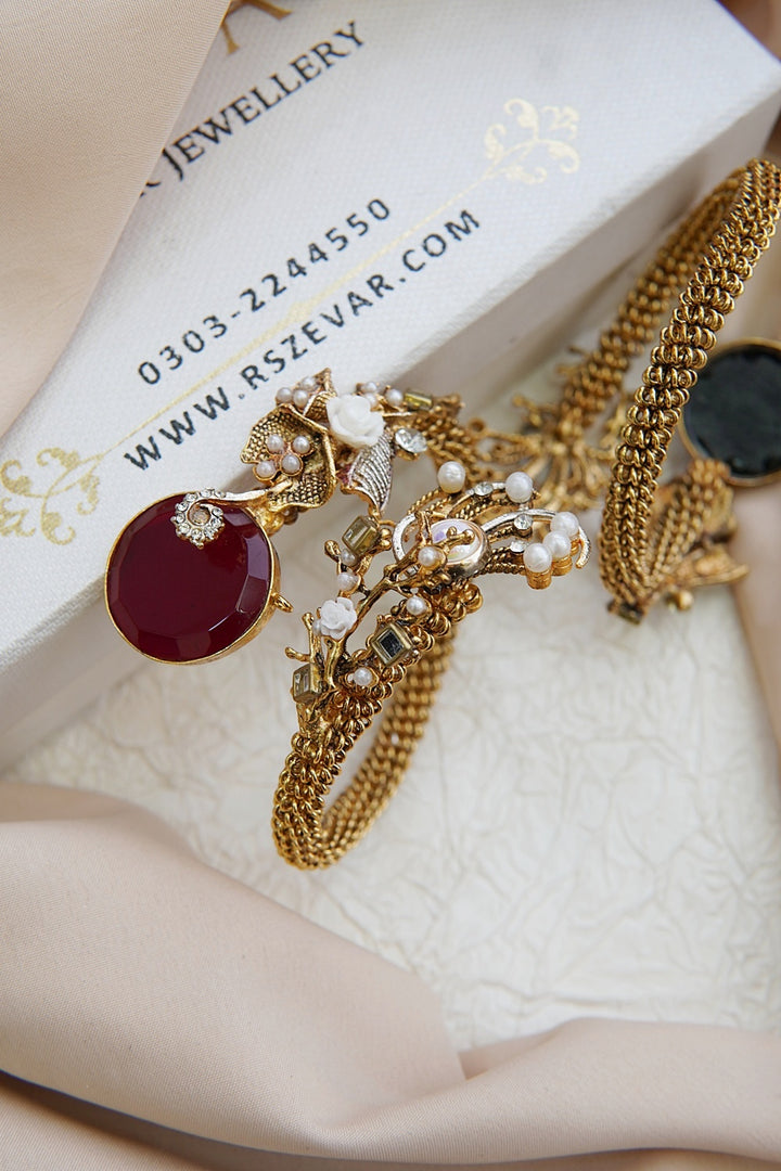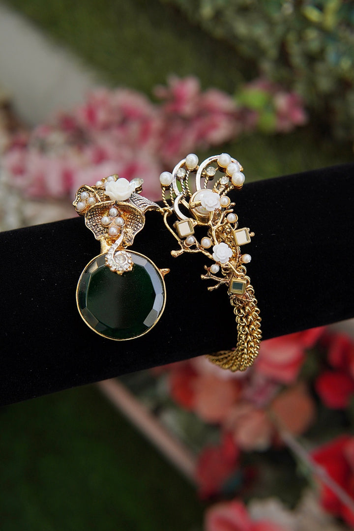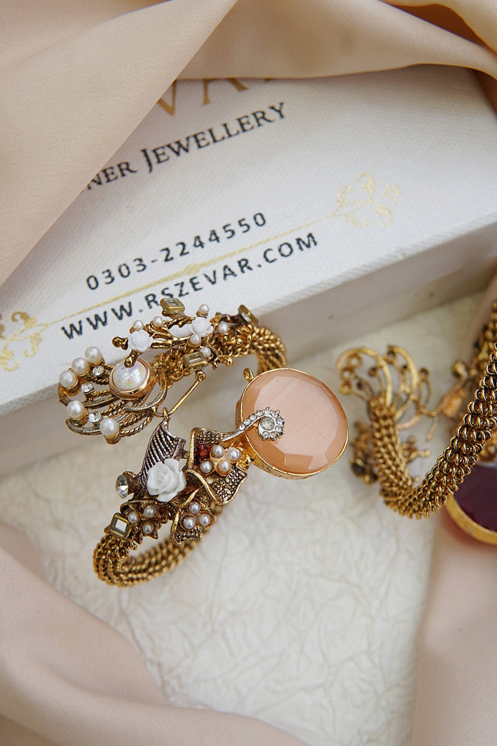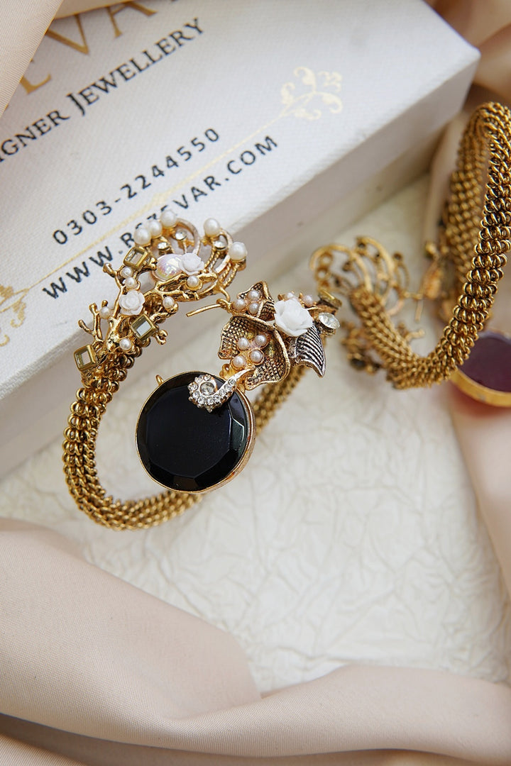 Indulge in the luxury of our Single Piece Turkish Handmade Kara. With antique gold plating and semi-precious work, this piece exudes elegance and sophistication. The high quality finishing and adjustable free size make it a versatile addition to any outfit. Elevate your style and make a statement with this unique and stunning piece.