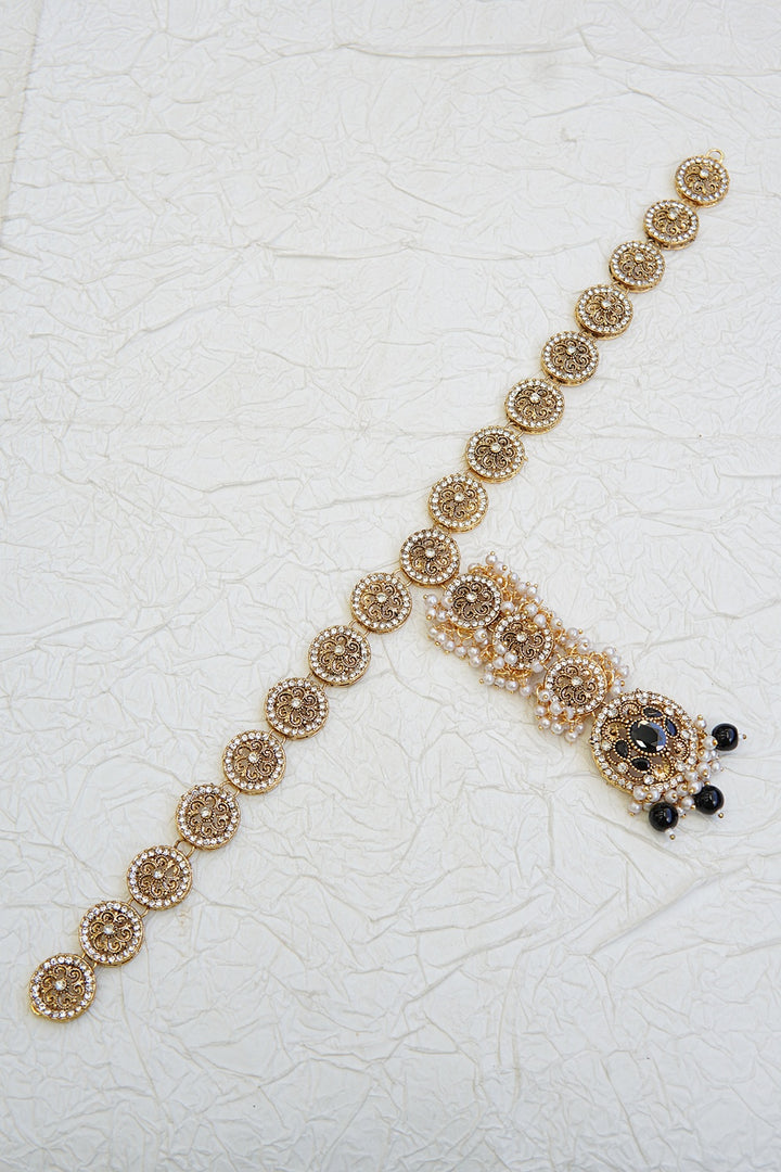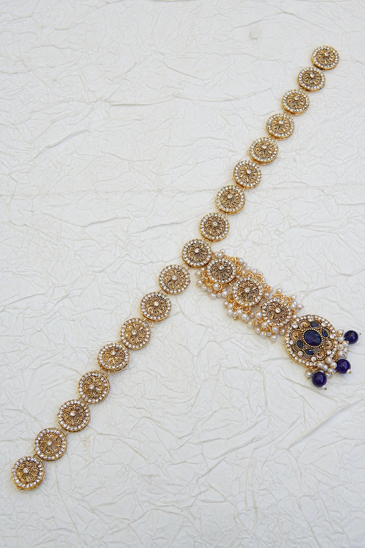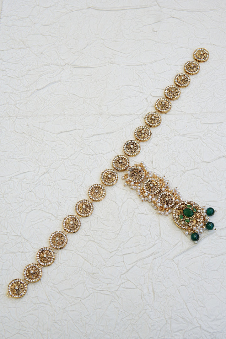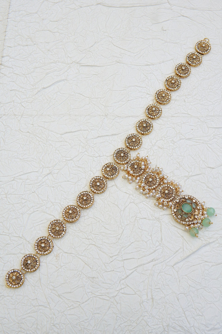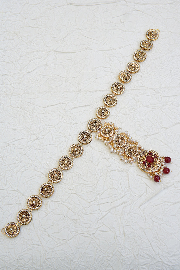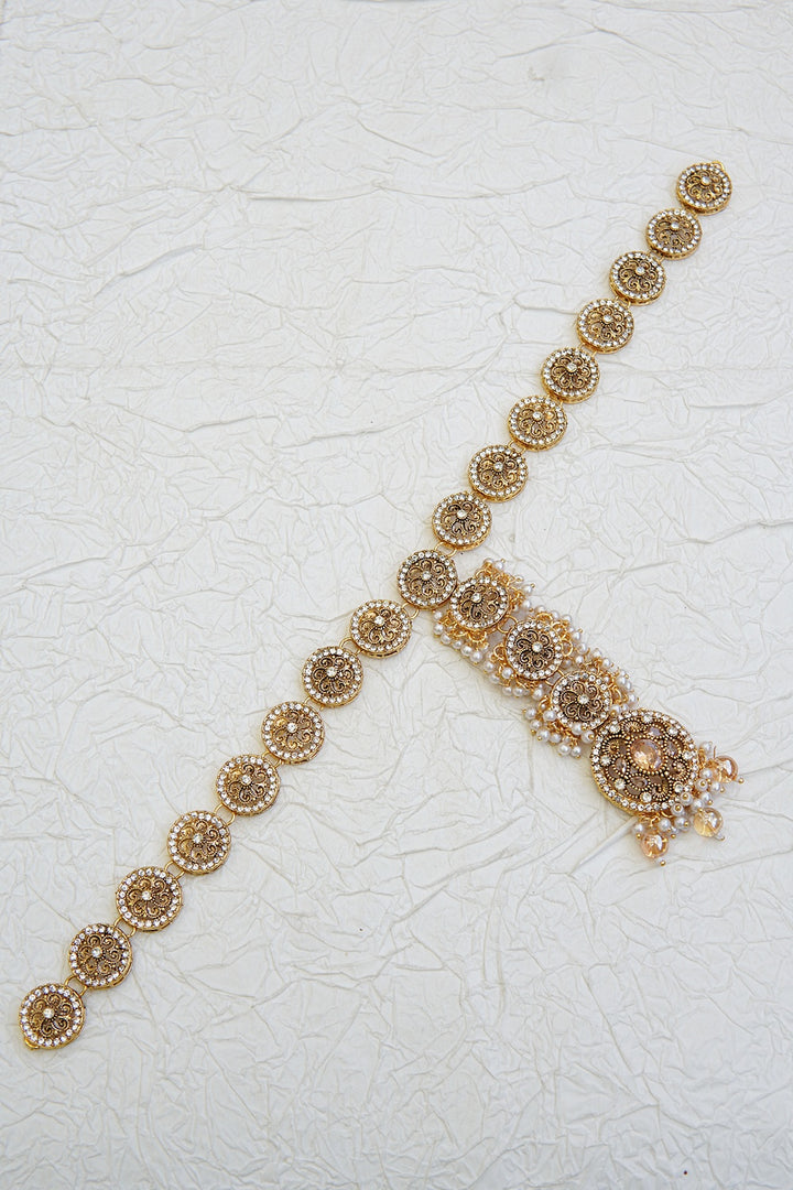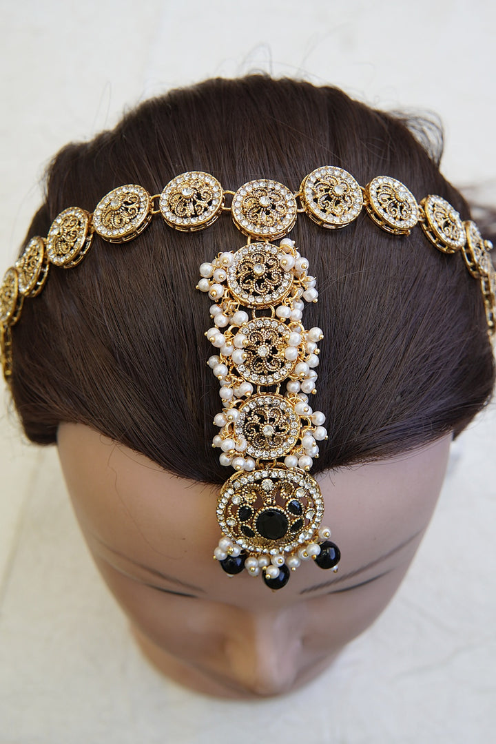 Elevate your bridal charm with our Timeless Pearl Embellished Matha Patti. Adorned with intricate round motifs and delicate pearl drops, this headpiece exudes a regal look. Perfect for traditional events, it adds grace and sophistication to any outfit. Available now for a limited time only on our premium.