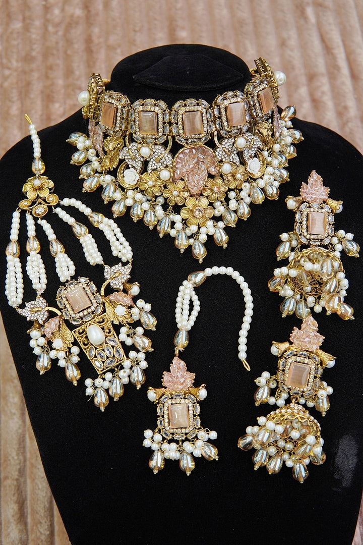 This Turkish Gold Plated Bridal Set is crafted with high-quality materials, featuring intricate hand-crafted detailing and stunning zircon accents. Made with copper, this collar set adds a touch of luxury to any bridal ensemble. Elevate your bride's look with this elegant and shining piece.