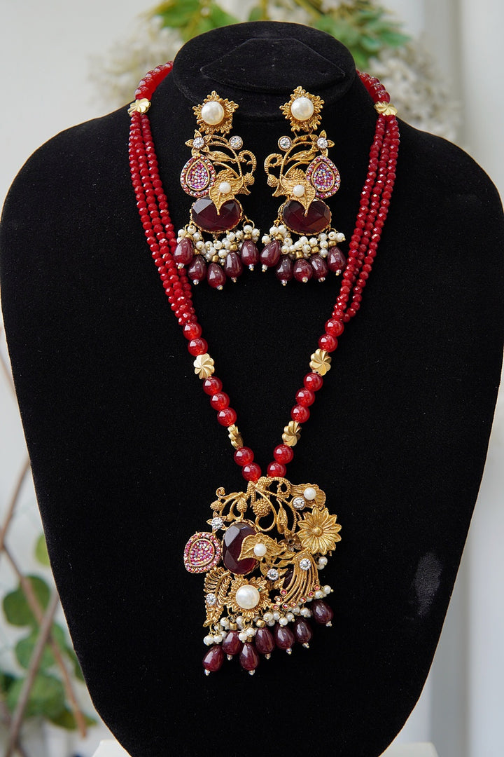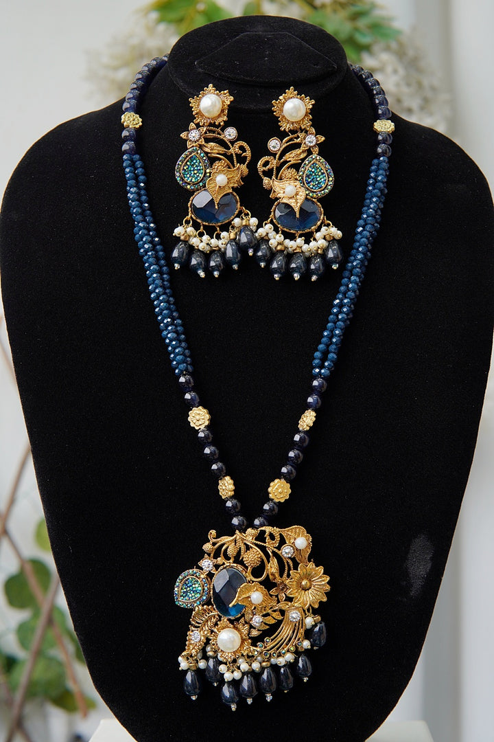 Elevate your style with our Turkish Gemstones Pendant Mala Set. This high quality plated accessory boasts an antique gold polish and semi-gemstones for a luxurious look. The approx 24 inches long mala adds a touch of elegance to any outfit. Upgrade your wardrobe with this must-have set.