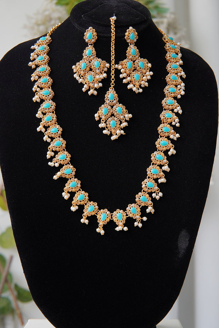 Expertly crafted with antique golden plating and semi-gemstones, the Turkish Long Ghini Mala Set is a stunning addition to any collection. This exquisite piece features a 26-inch long mala, complete with matching earrings and teeka, all made from high-quality copper casting material. Elevate your style with this unique and elegant set.