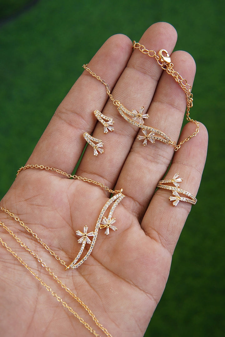 Elevate your look with our Zirconia Pendant Set Combo. Crafted with high quality golden and silver plating, this set includes an adjustable ring, bracelet, chain, and studs. Adorned with pure zircons, it exudes elegance and sophistication. Perfect for any occasion, add a touch of glamour to any outfit.