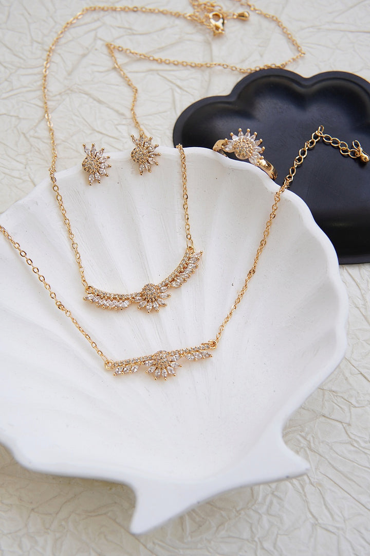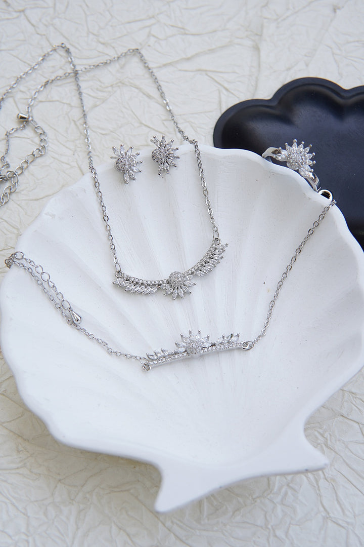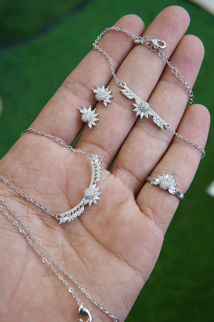 Elevate your style with our Zirconia Pendant Set. This set comes with a beautiful rose-gold or silver shine plating, approx 22 inches long chain, and adjustable bracelet and ring. The high-quality zircons add a touch of luxury and sophistication to any outfit.